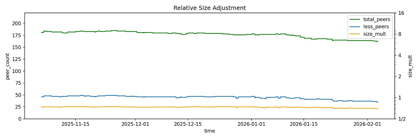 The first multiplier is based on the relative size of the node’s total capacity with respect to its peers’. CLBOSS will apply a lower multiplier when the node is smaller compared to its peers, and a higher one if it is bigger.